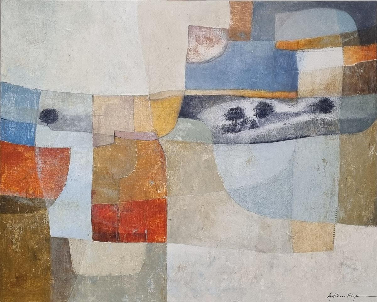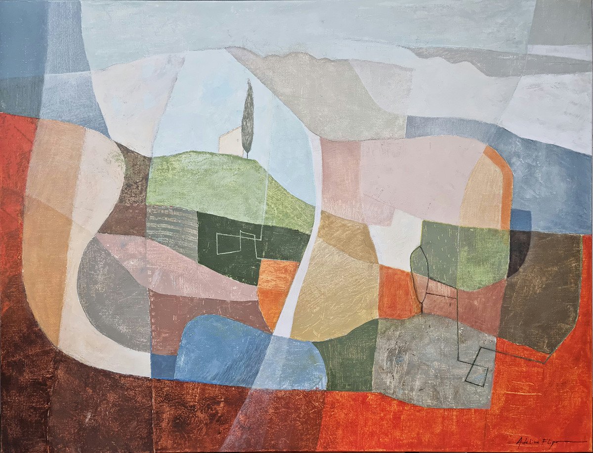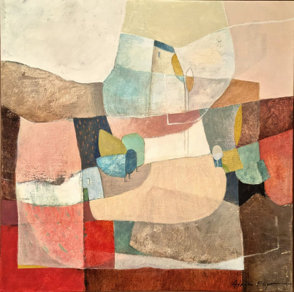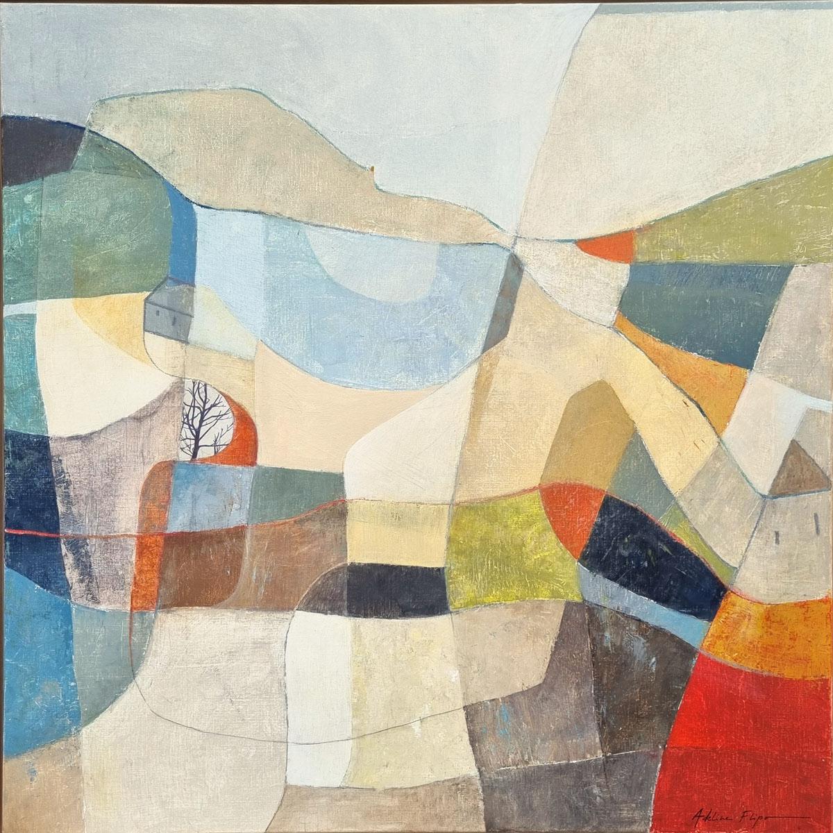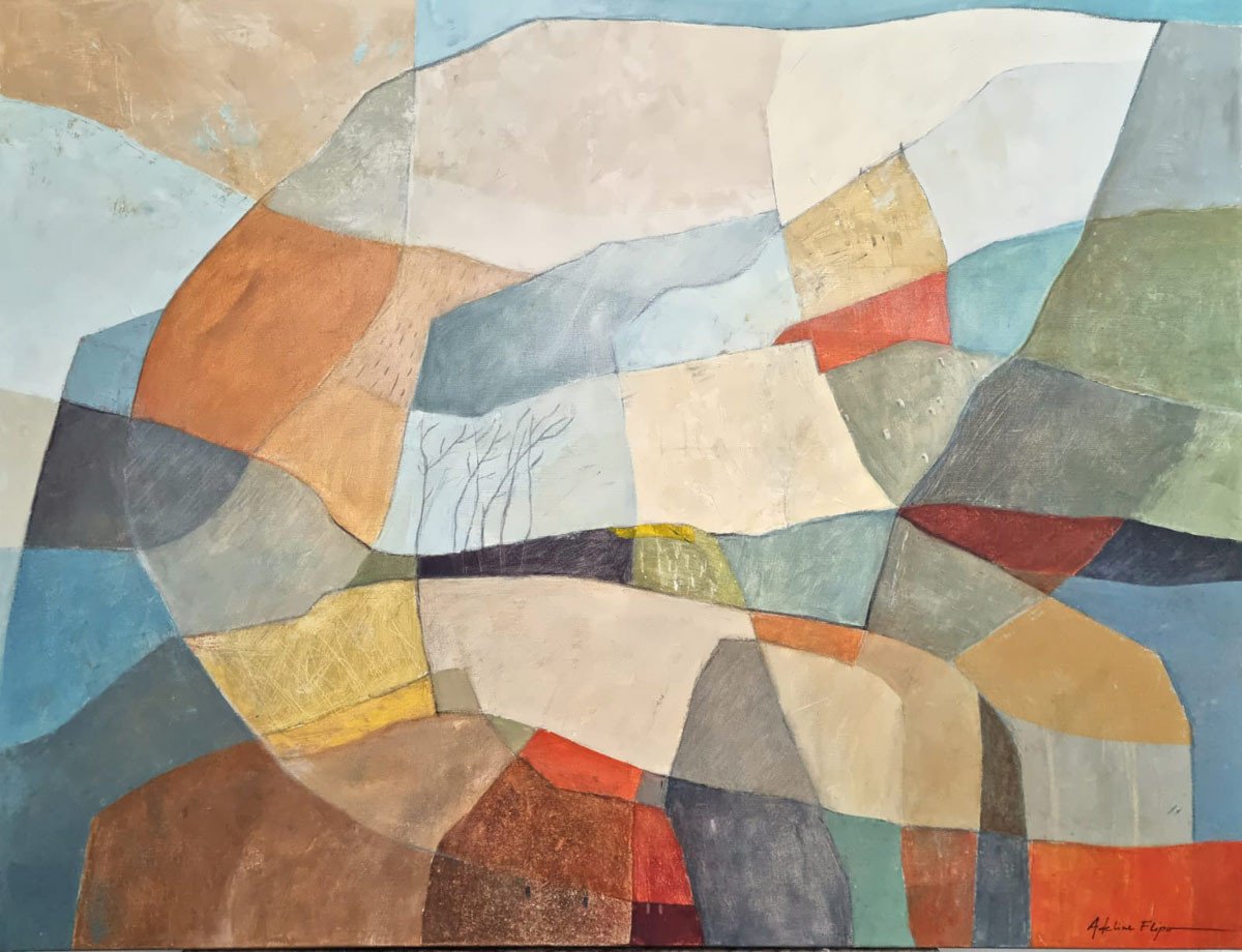 Achter de schijnbare abstractie ontdek je organische tinten die doen denken aan een herinnerd landschap. Soms duikt er stilletjes een boom op, of een verborgen hut, fragiele sporen van een stille aanwezigheid.