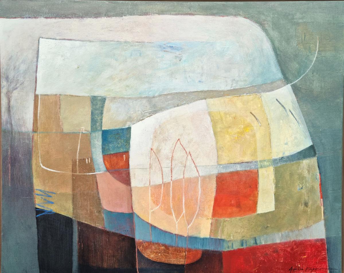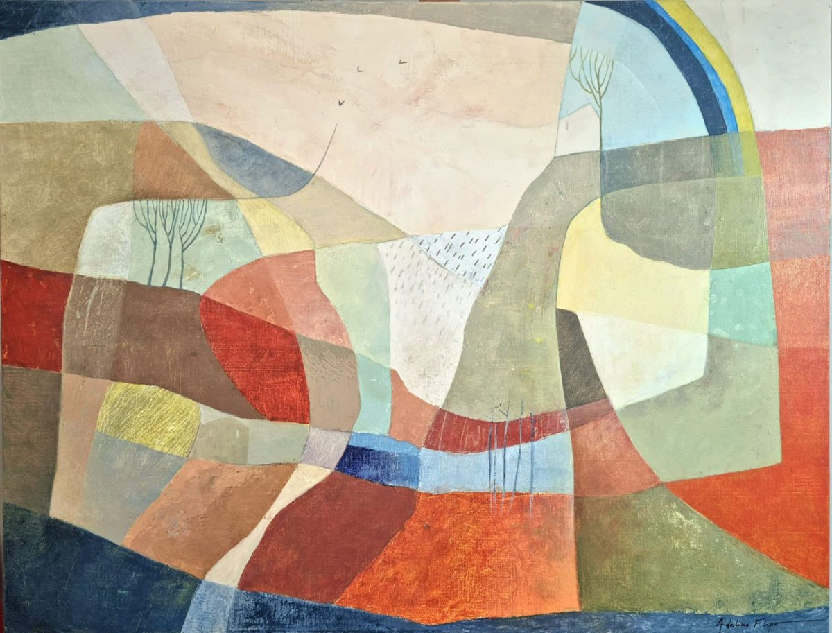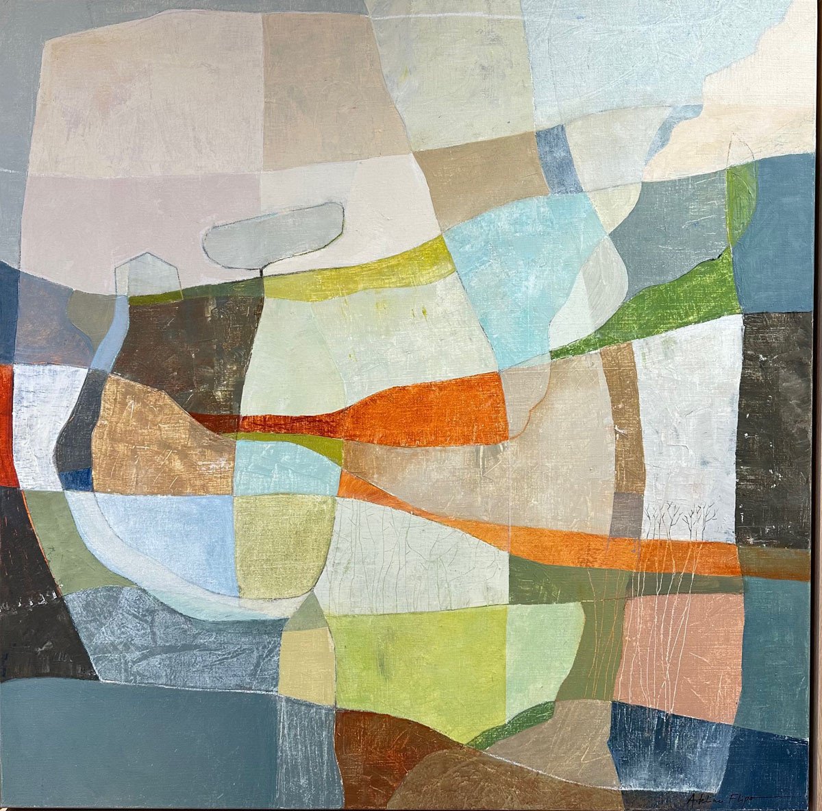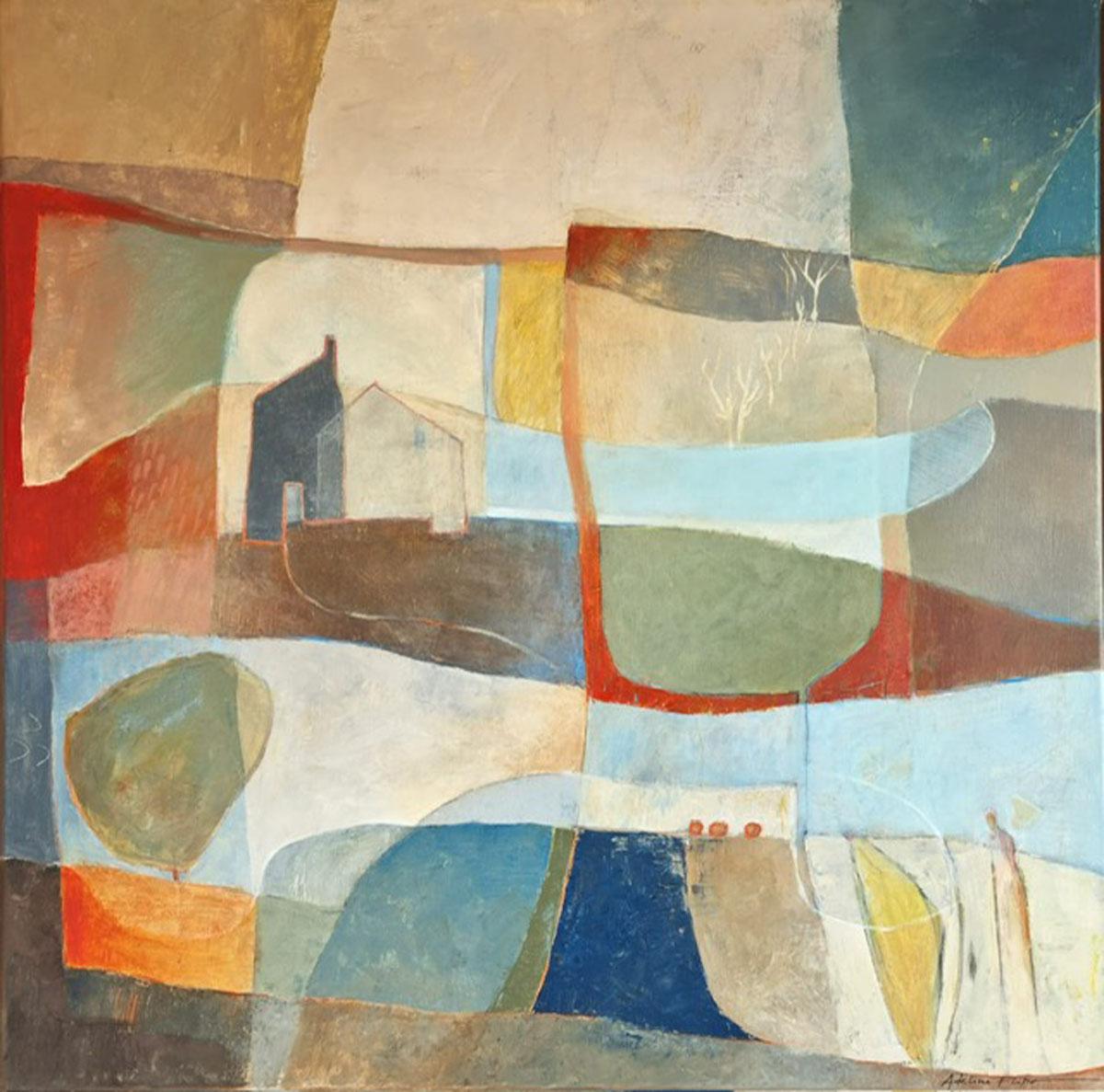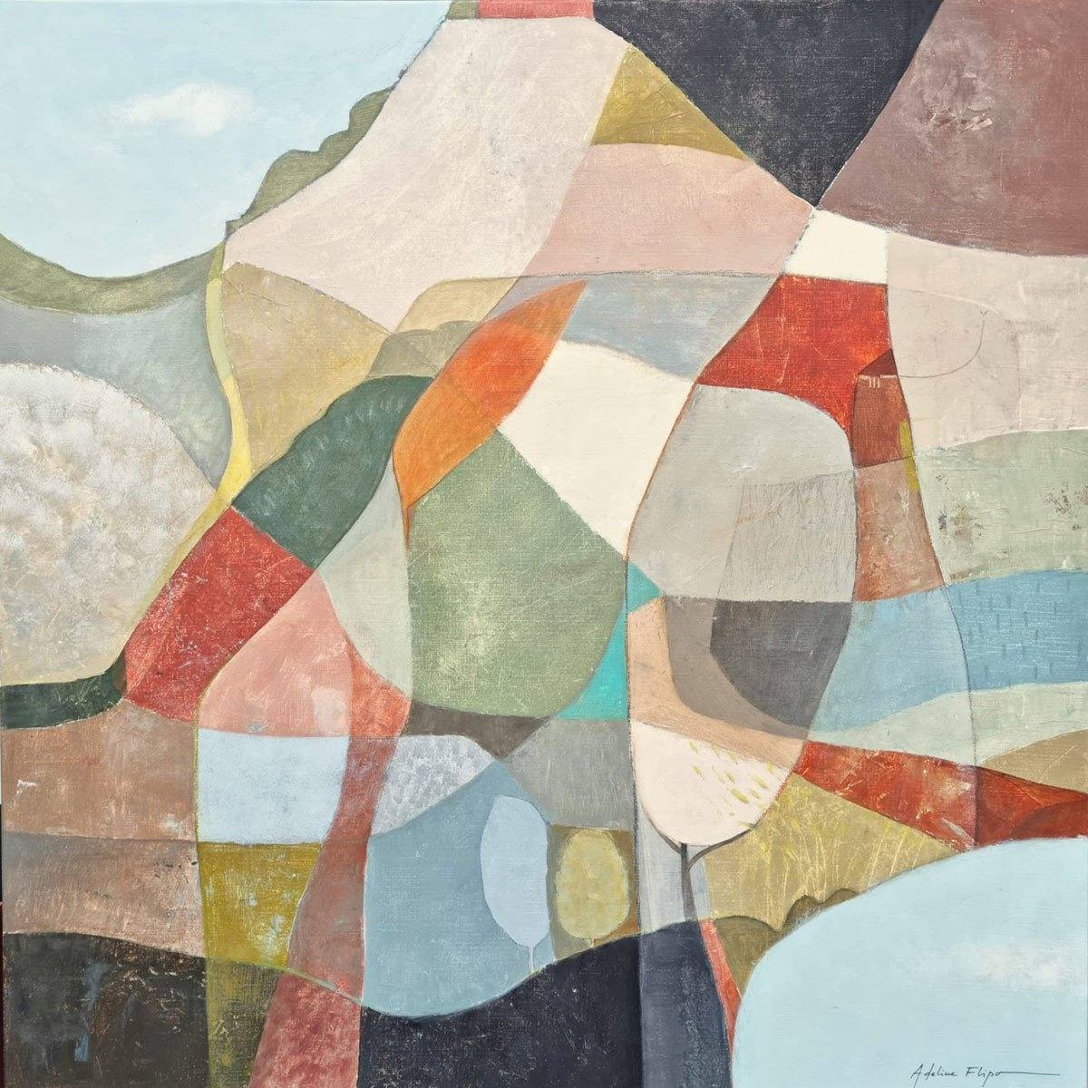 Achter de schijnbare abstractie ontdek je organische tinten die doen denken aan een herinnerd landschap. Soms duikt er stilletjes een boom op, of een verborgen hut, fragiele sporen van een stille aanwezigheid.