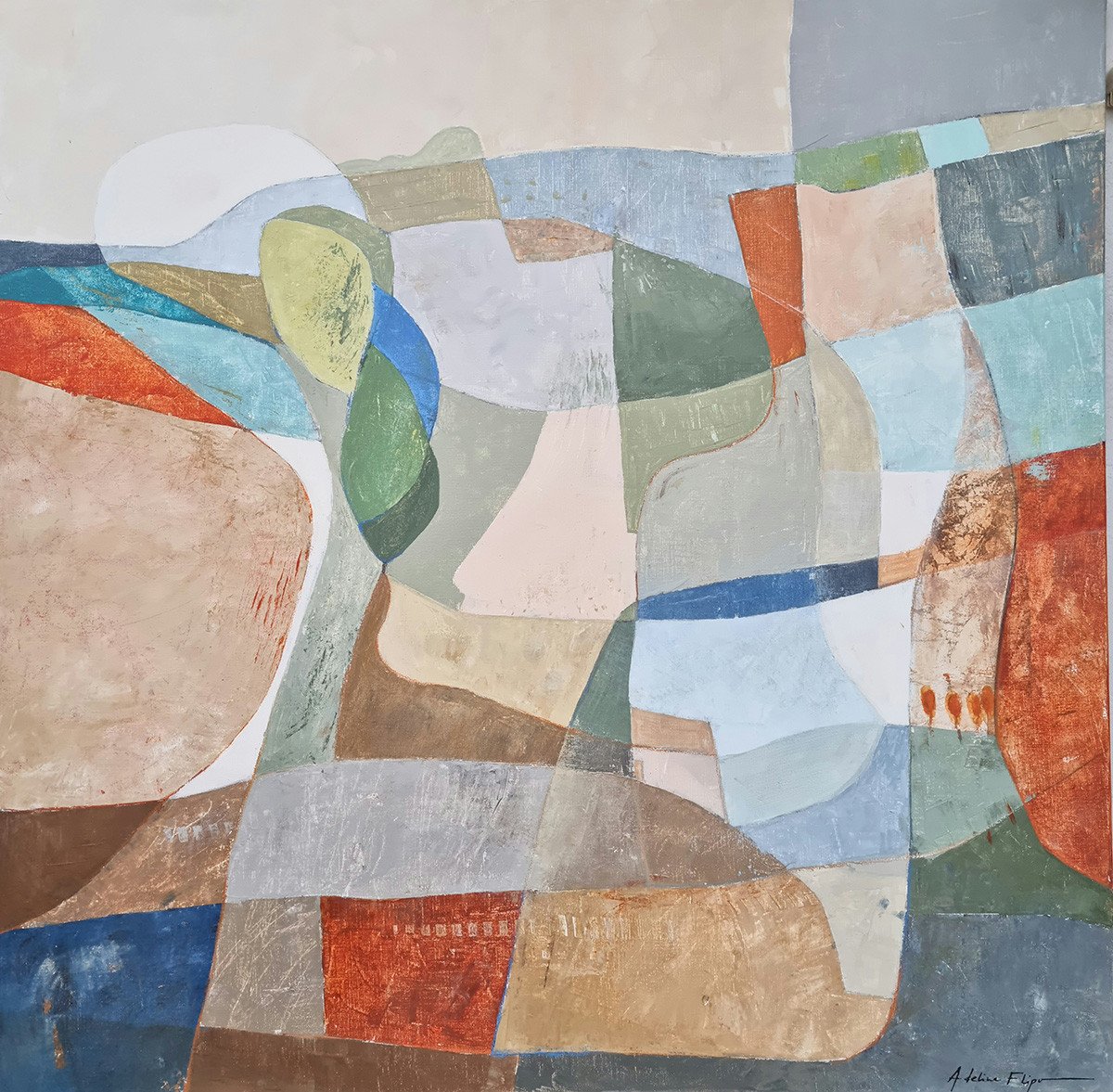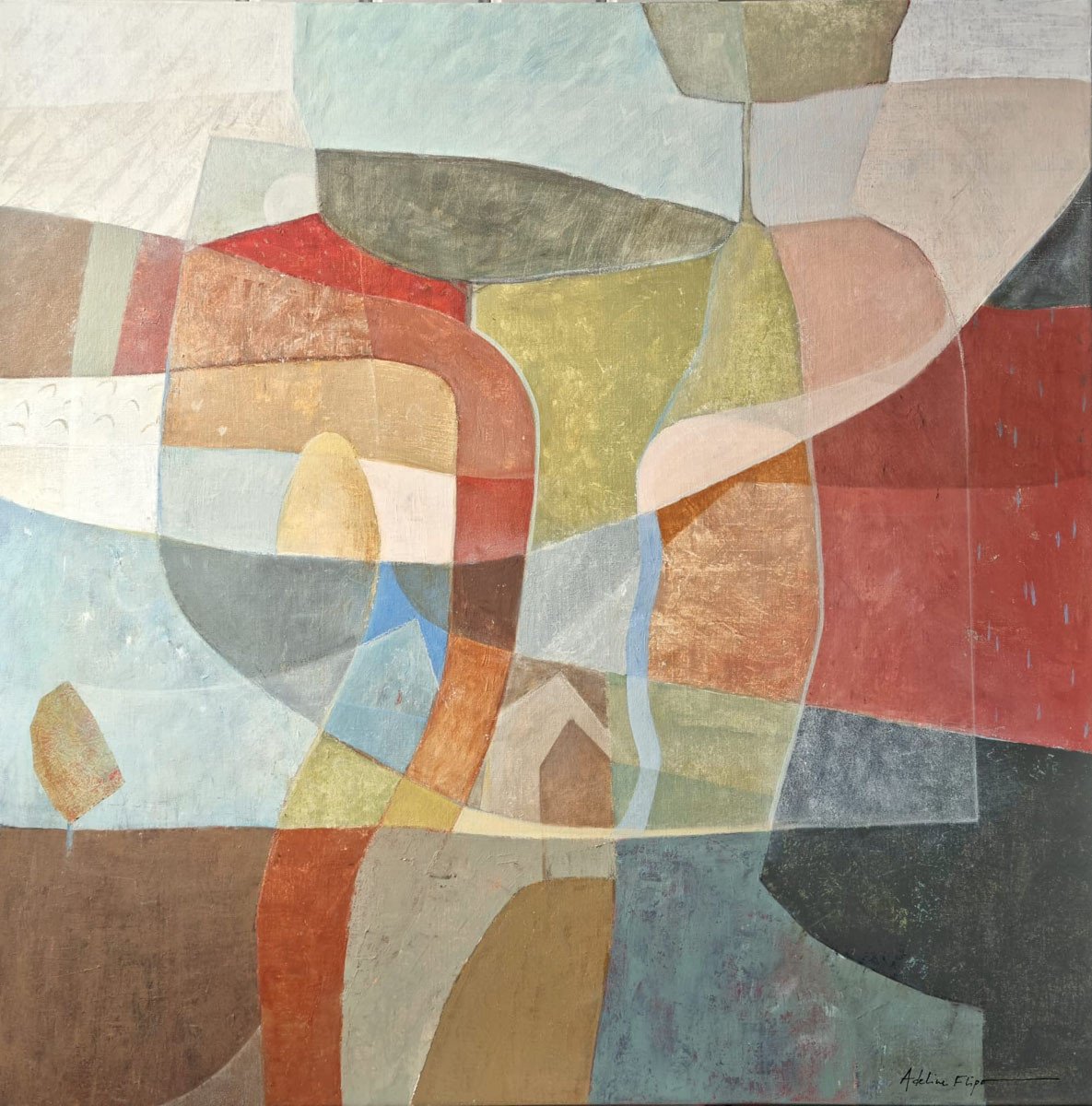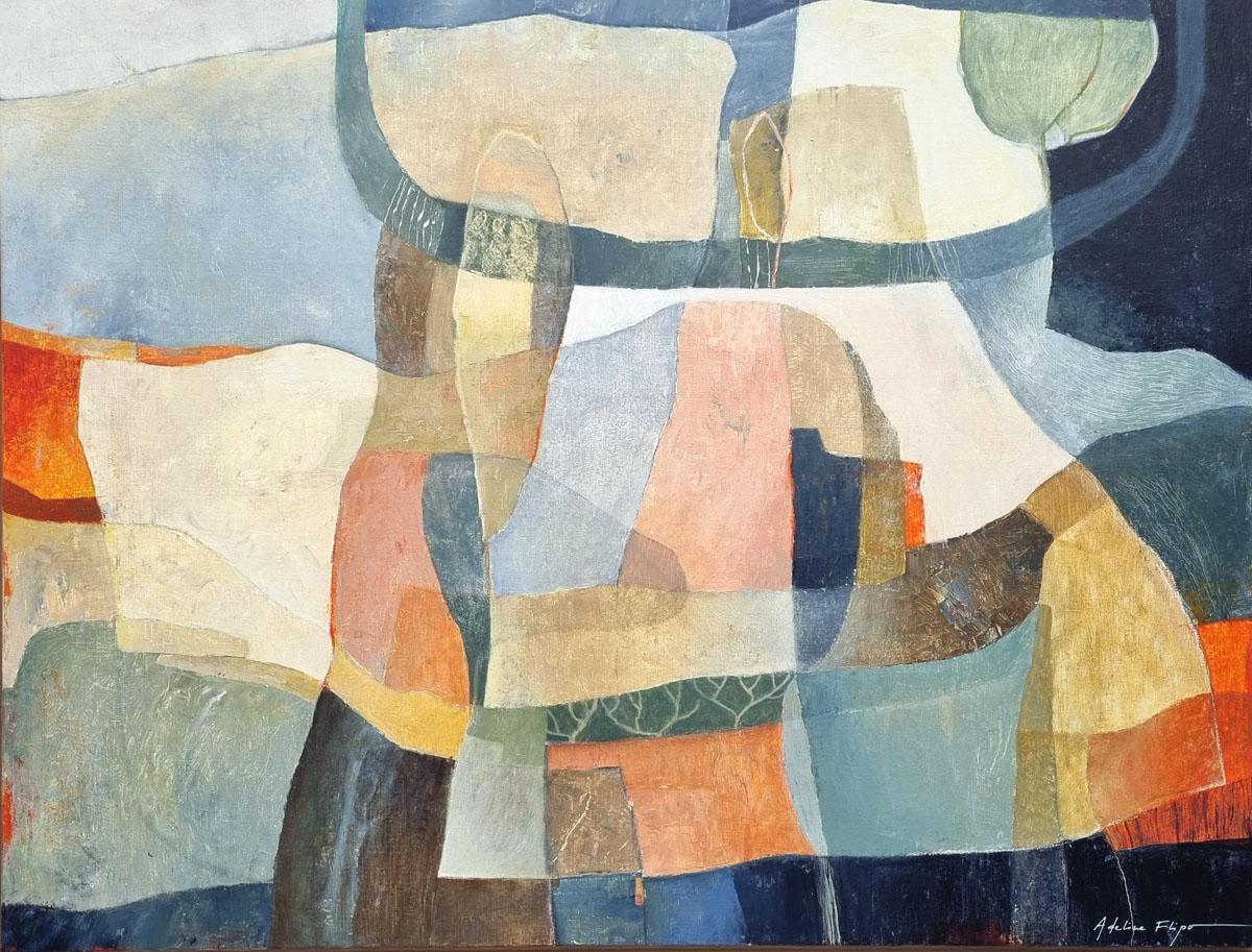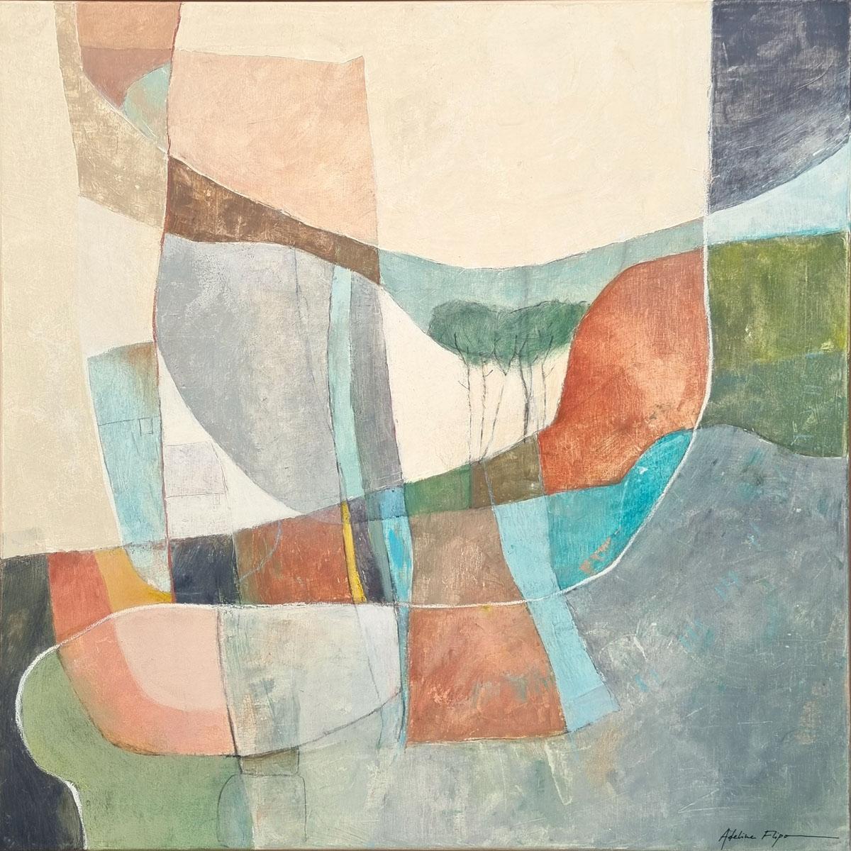 Au milieu de cette apparente abstraction les teintes souvent organiques évoquent le souvenir d'un paysage où se cache volontiers la présence discrète d’un arbre, d’une cabane. Ses couleurs douces, ses jeux de transparences créent une danse visuelle entre calme et effervescence.