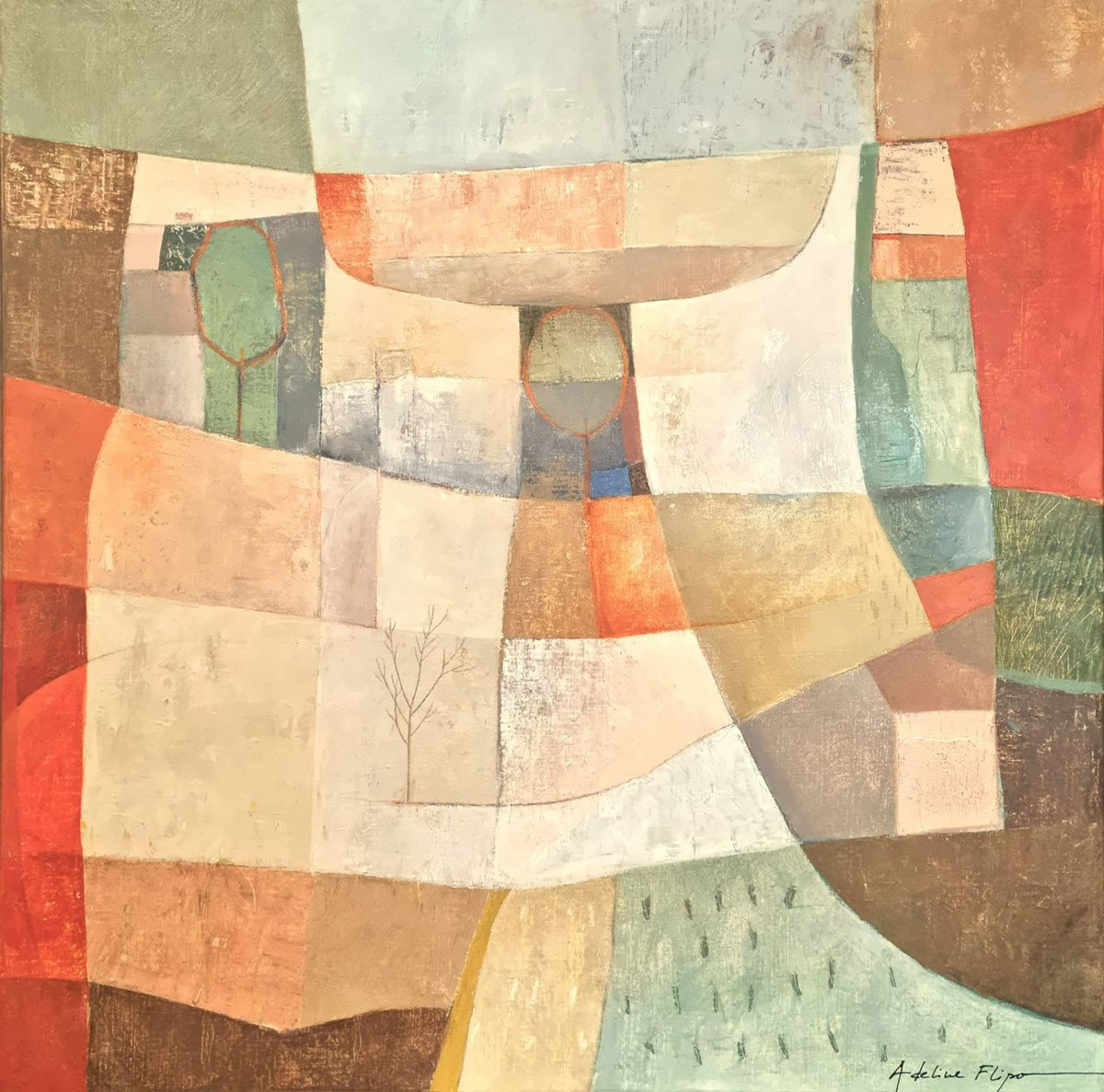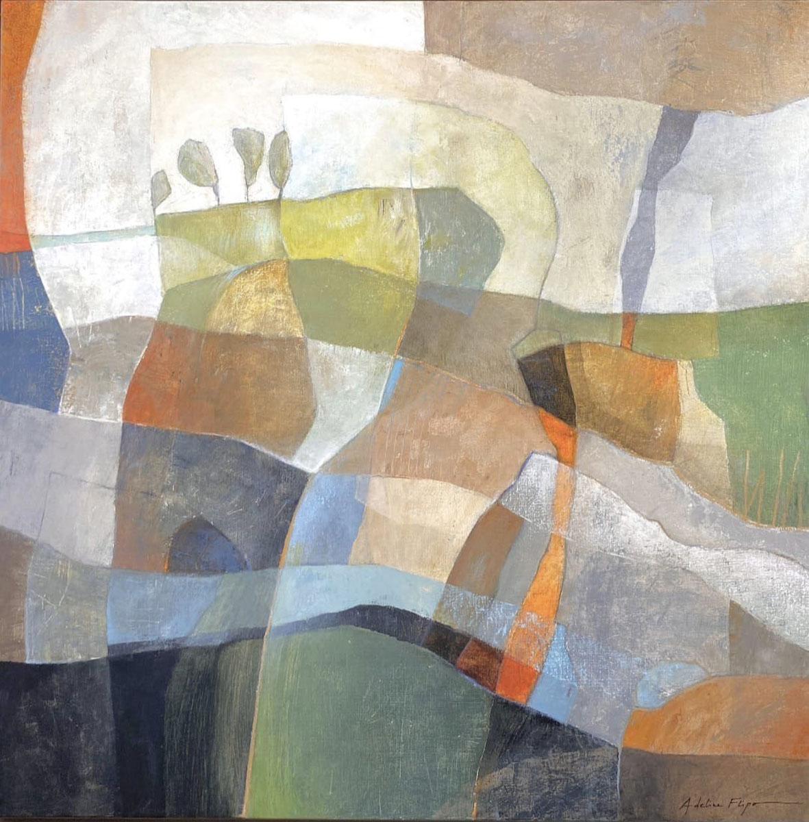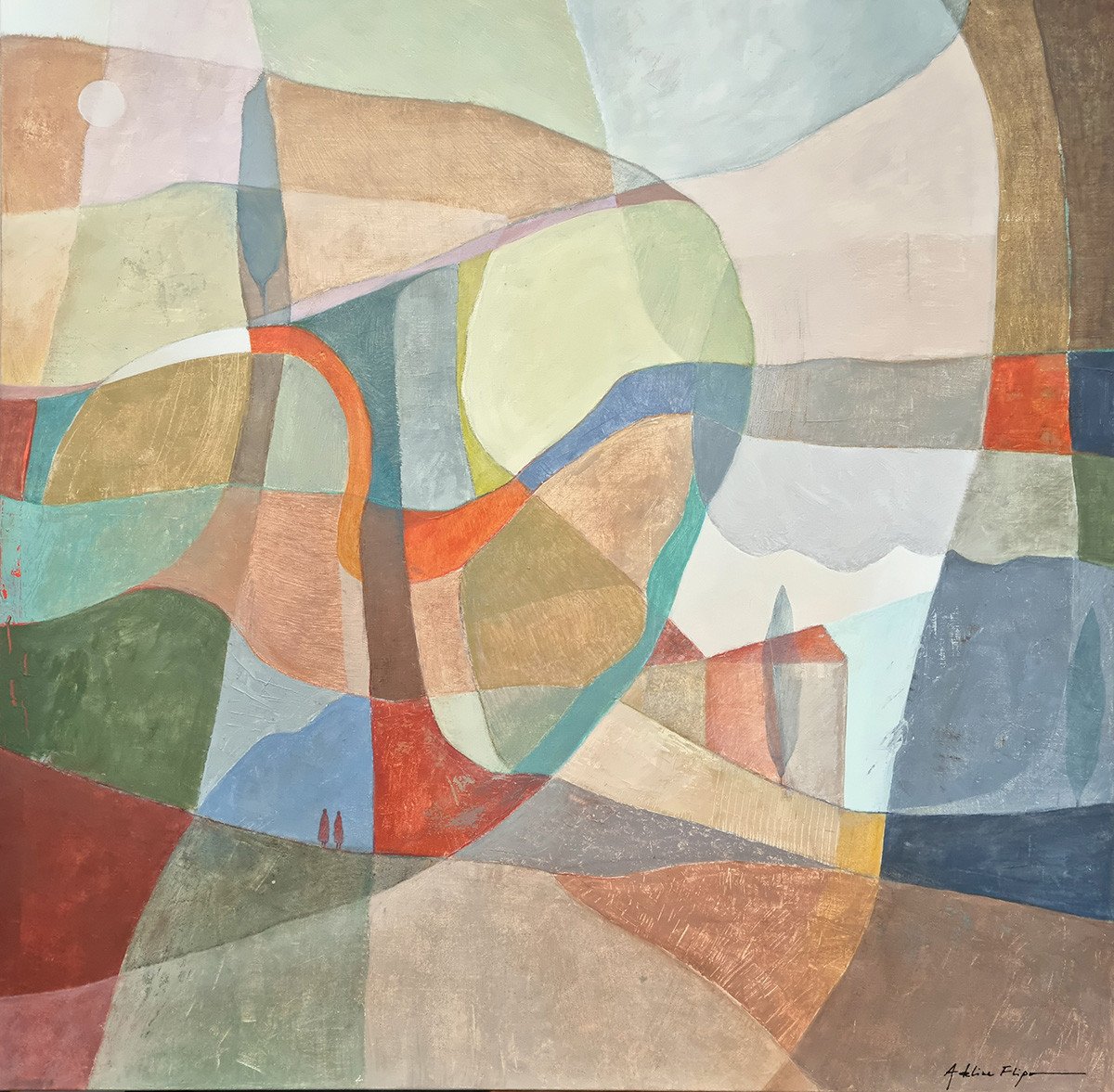 Au milieu de cette apparente abstraction les teintes souvent organiques évoquent le souvenir d'un paysage où se cache volontiers la présence discrète d’un arbre, d’une cabane. Ses couleurs douces, ses jeux de transparences créent une danse visuelle entre calme et effervescence.