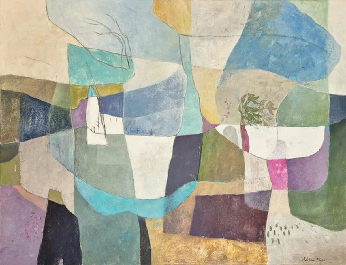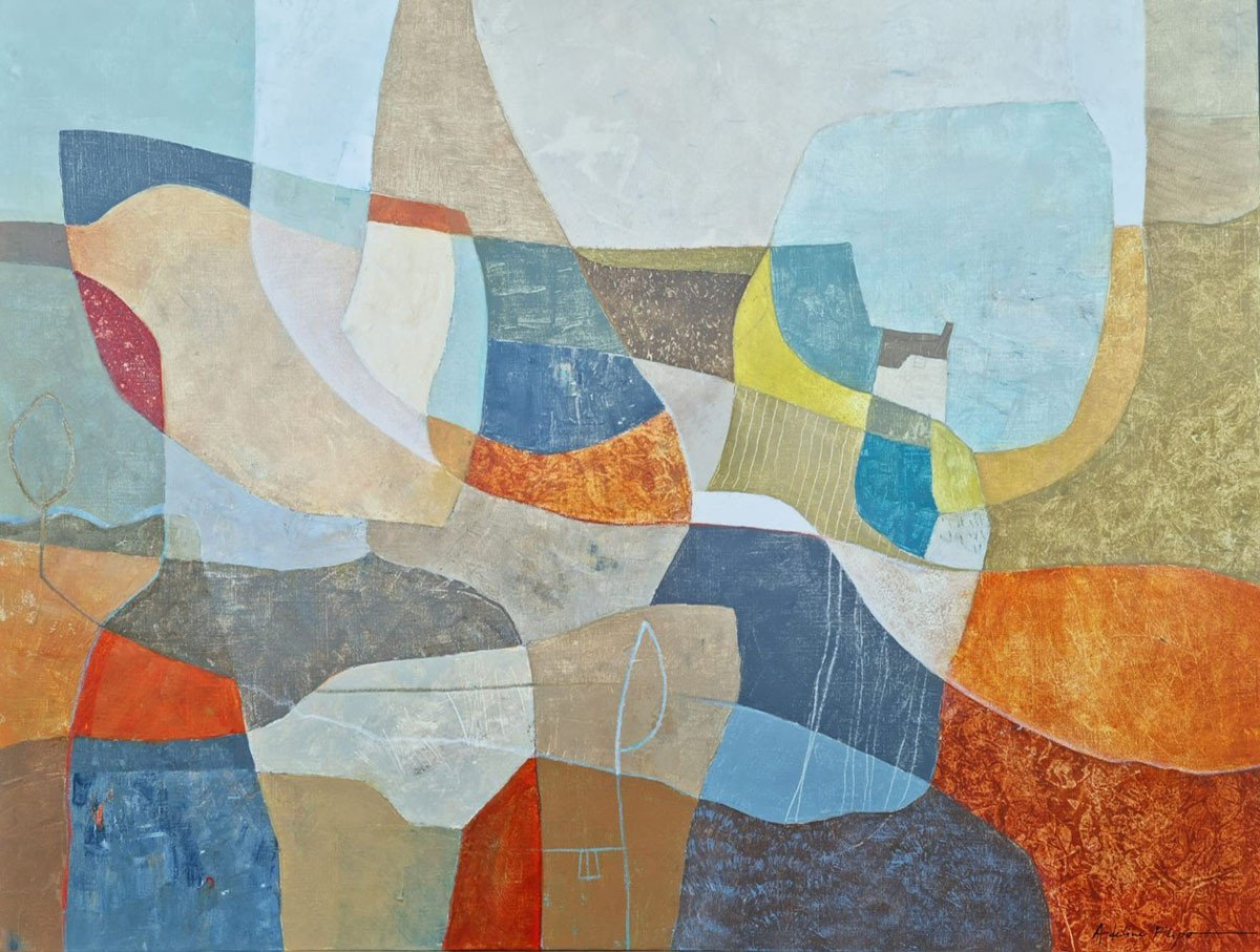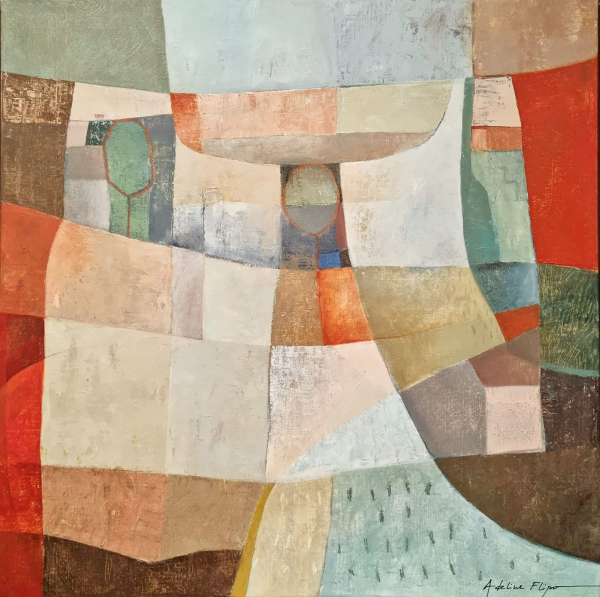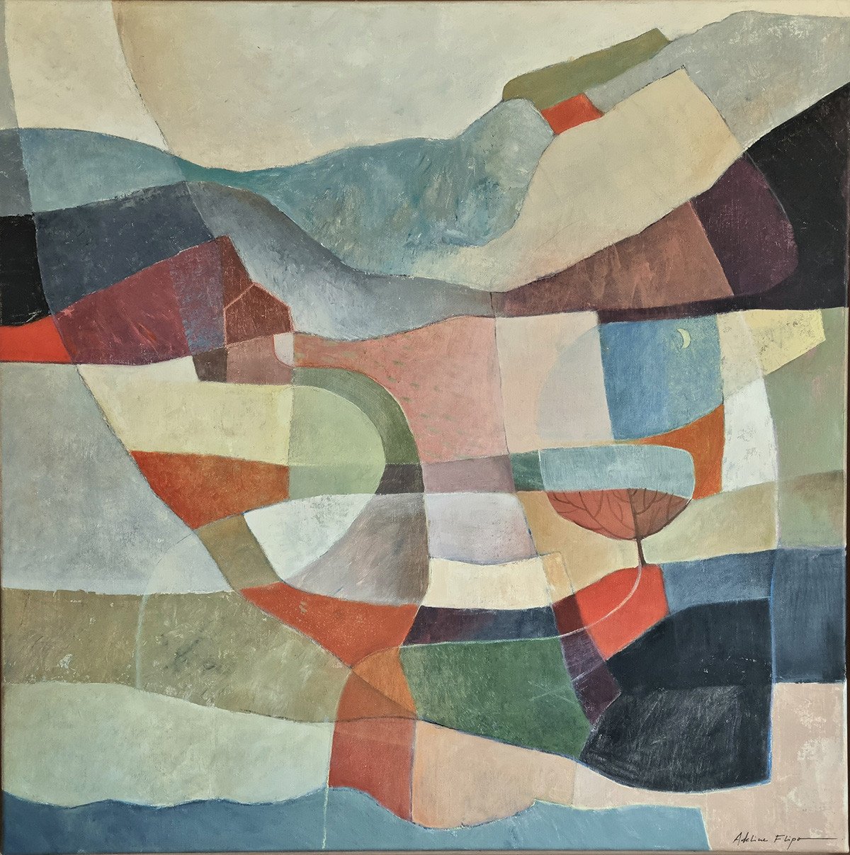 Au milieu de cette apparente abstraction les teintes souvent organiques évoquent le souvenir d'un paysage où se cache volontiers la présence discrète d’un arbre, d’une cabane. Ses couleurs douces, ses jeux de transparences créent une danse visuelle entre calme et effervescence.
